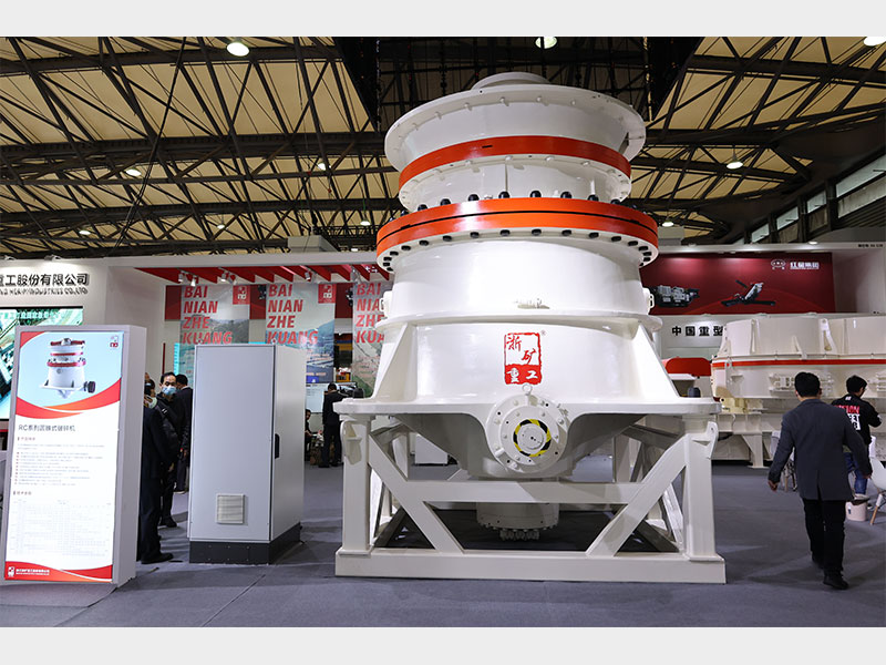 RC系列單缸液壓圓錐式破碎機(jī)工作過程中,電動機(jī)通過傳動裝置帶動偏心套旋轉(zhuǎn),動錐在偏心軸套的迫動下做旋轉(zhuǎn)擺動,動錐靠近定錐的區(qū)段即成為破碎腔,物料受到動錐和定錐的多次擠壓和撞擊而破碎。動錐離開該區(qū)段時(shí),該處已破碎至要求粒度的物料在自身重力作用下下落,從錐底排出。排料口的大小需要靠底部一個液壓缸的升降來調(diào)節(jié)。